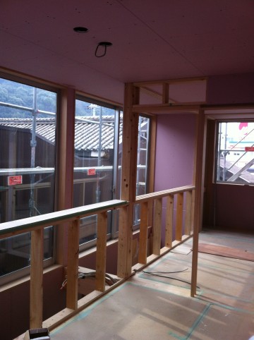 外部の工事はあらかた完成し、内部では壁天井のクロスが貼られています。