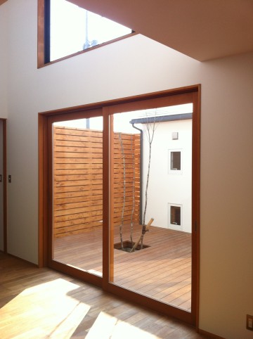 中庭のデッキテラスには、「木漏れ日」をめざしたシンボルツリーを配し、その下で戯れる愛犬、愛猫たち・・・